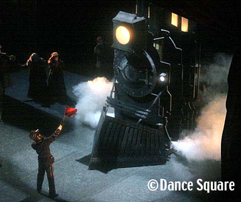 幕開きに出現する巨大な汽車は、何度見てもその迫力に圧倒される。やがて汽車から降り立つヒロイン、アンナ・カレーニナ。下村は、ここで存在感を放ち、見る者を一挙に舞台に惹きつける。レフ・トルストイの原作は全三巻という長編。それを3幕13場に纏め上げたのはプロコフスキーの才である。トルストイの小説は執筆開始から単行本上梓まで4年の歳月が流れているが、「プロコフスキーは4年がかりで、この作品をバレエ化した」(プレ・トークでの法村牧緒氏談)そうだ。さすがに丹念に練られた演出・構成である。ただ、そのドラマの流れを観客に伝えるのは、言うまでもなく、ダンサーの、特にアンナ役プリマの力量だ。 |